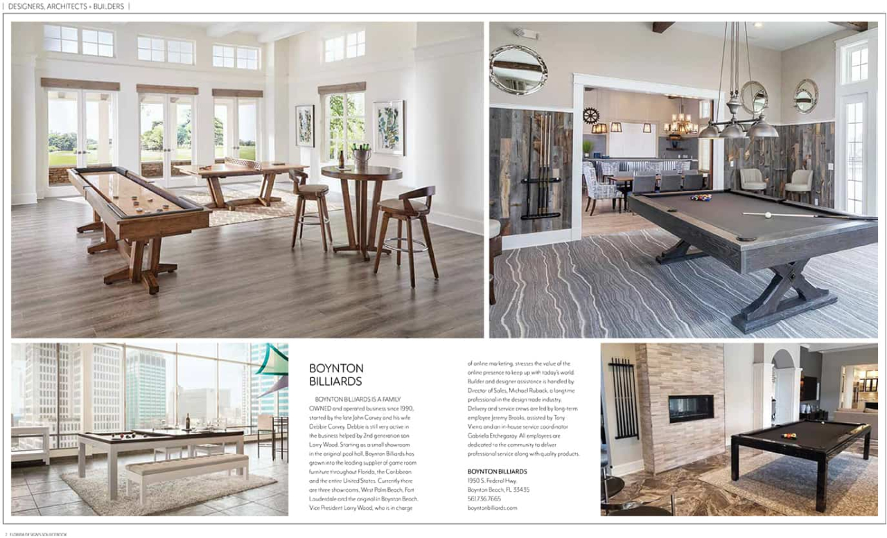 Boynton Billiards is a family owned and operated business since 1990, started by the late John Corvey and his wife Debbie Corvey. Debbie is still very active in the business helped by 2nd generation son Larry Wood. Starting as a small showroom in the original pool hall, Boynton Billiards has grown into the leading supplier of game room furniture throughout Florida, the Caribbean and the entire United States. Currently there are 3 showrooms, West Palm Beach, Ft. Lauderdale and the original in Boynton Beach. Vice President Larry Wood, who is in charge of online marketing, stresses the value of the online presence to keep up with today’s world. Builder and designer assistance is handled by Director of Sales, Michael Ruback, a long time professional in the design trade industry. Delivery and service crews are led by long term employee Jeremy Brooks, assisted by Tony Vierra and an in house service coordinator Gabriela Etchegaray. All employees are dedicated to the community to deliver professional service along with quality products.