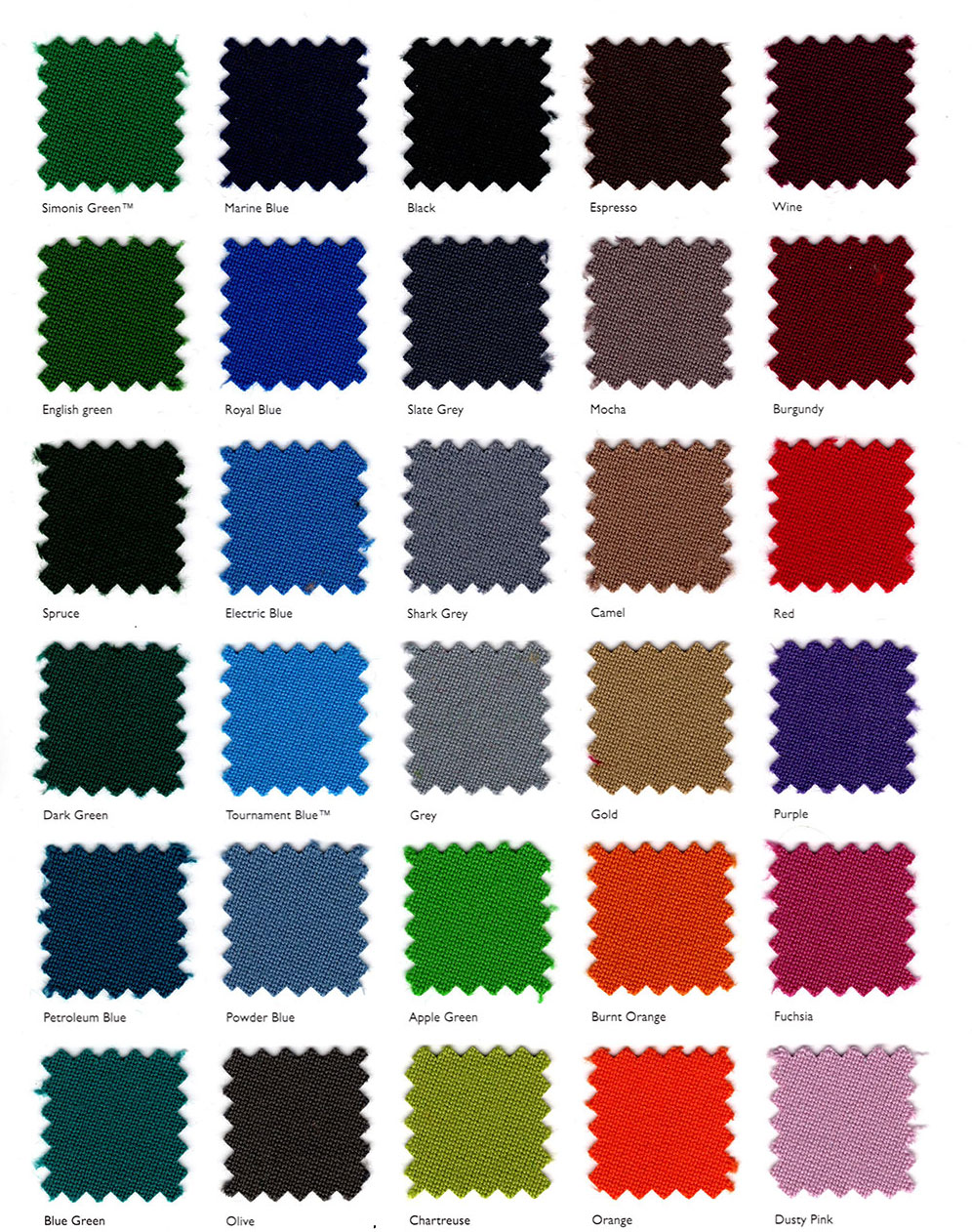 • Available in 27 colors: Simonis Green™, Blue Green, Petroleum Blue, English Green, Dark Green, Spruce, Powder Blue, Tournament Blue™, Electric Blue, Royal Blue, Marine Blue, Gold, Camel, Mocha, Olive, Espresso, Red, Burgundy, Wine, Fuchsia, Purple, Grey, Slate Grey, Black, Chartreuse, Orange, and Burnt Orange. (not all colors available in 66″ and 78″ rolls)